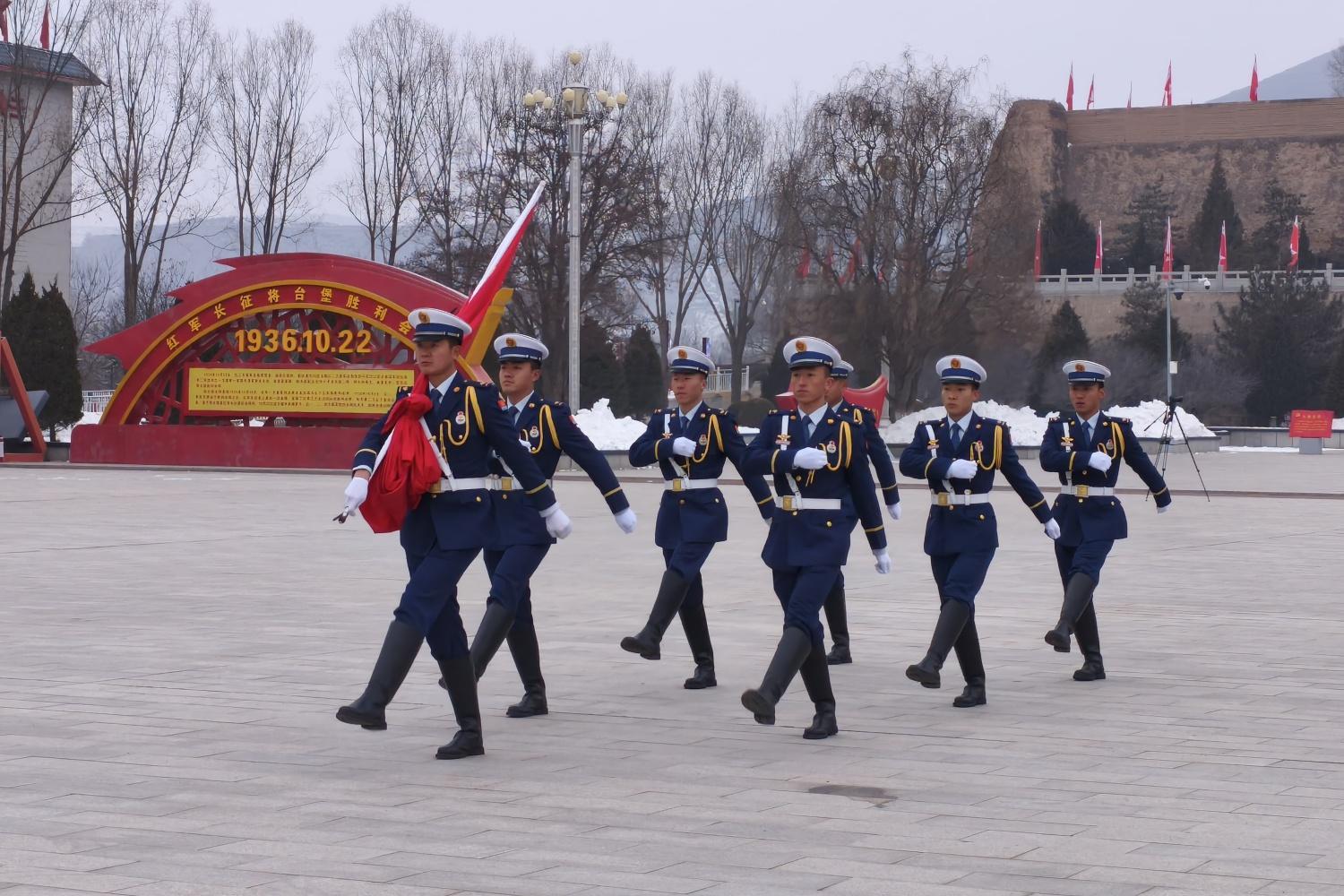 “正步走!”每月重大節(jié)日當(dāng)天,在將臺堡紅軍長征會師紀(jì)念碑前的廣場上,該站“國旗護(hù)衛(wèi)隊(duì)”的隊(duì)員們身著禮服,步伐鏗鏘。執(zhí)旗手肩扛國旗穩(wěn)如磐石,護(hù)旗手目光如炬、儀容嚴(yán)整。無論嚴(yán)寒酷暑,這支隊(duì)伍總是準(zhǔn)時出現(xiàn)在廣場,在晨光中將國旗隨朝陽一同升起,自豪感震撼人心。記者了解到,該站除日常滅火救援工作外,還肩負(fù)每月組織升旗儀式、在重大活動中敬獻(xiàn)花籃的崇高使命。