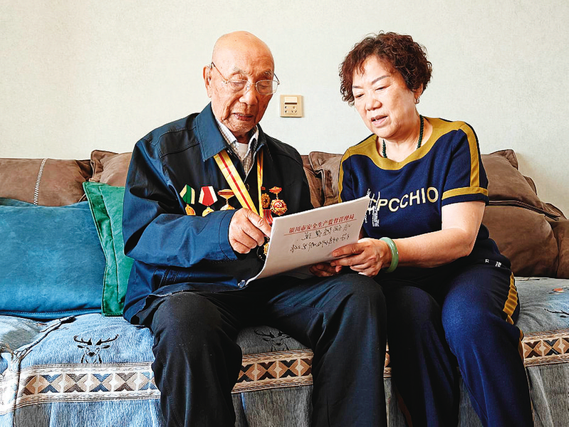 抗戰(zhàn)老兵馬章鎖(左一)和女兒一起閱讀。
