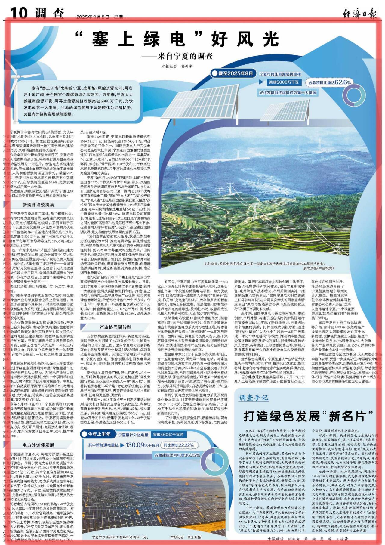 素有“塞上江南”之稱的寧夏,太陽能、風能資源充沛,可利用土地廣闊,是全國首個新能源綜合示范區(qū)。近年來,寧夏大力推進新能源開發(fā),可再生能源裝機規(guī)模突破5000萬千瓦,光伏發(fā)電成第一大電源。當?shù)氐木G電優(yōu)勢正加速轉化為經(jīng)濟優(yōu)勢,為區(qū)內(nèi)外經(jīng)濟發(fā)展賦能添綠。