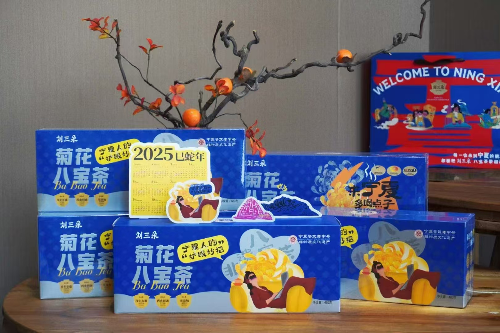 在劉三朵八寶茶體驗(yàn)館,濃郁的傳統(tǒng)文化氣息與現(xiàn)代創(chuàng)新設(shè)計(jì)相映成趣。劉三朵“浪寧夏”八寶茶心意禮盒以精美插畫(huà)結(jié)合生肖元素,標(biāo)注“寧夏人的早茶搭子”“寧夏餐飲老字號(hào)”“非物質(zhì)文化遺產(chǎn)”等宣傳語(yǔ),既體現(xiàn)地域特色,也強(qiáng)調(diào)文化傳承,兼具裝飾性與實(shí)用性,成為中秋贈(zèng)禮的理想選擇。