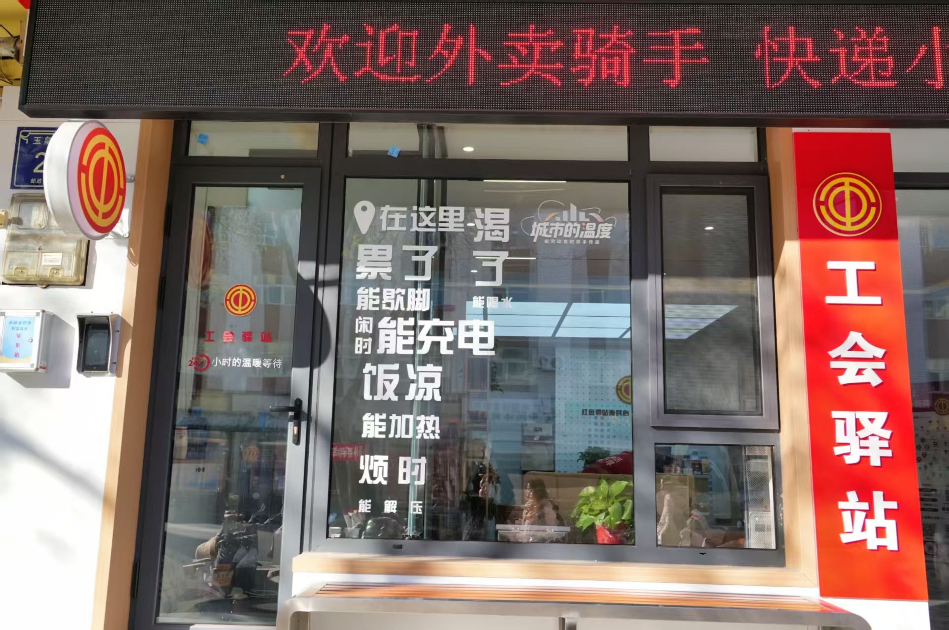 驛站的核心在于提供精準(zhǔn)、全天候的服務(wù)。一樓生活服務(wù)區(qū)配備了飲水機(jī)、微波爐、冰箱、充電設(shè)備等基礎(chǔ)設(shè)施,切實(shí)解決了騎手們“吃飯、喝水、休息”的基本需求。特別設(shè)置的24小時(shí)茶水間,采用人臉識(shí)別系統(tǒng),確保溫暖服務(wù)全天候在線。此外,驛站還構(gòu)建了“4個(gè)工會(huì)驛站+21個(gè)商戶微驛站”的聯(lián)動(dòng)服務(wù)網(wǎng)絡(luò),通過與周邊商戶合作提供積分兌換、折扣就餐等多元化服務(wù),將工會(huì)的溫暖延伸到商圈的每一個(gè)角落。