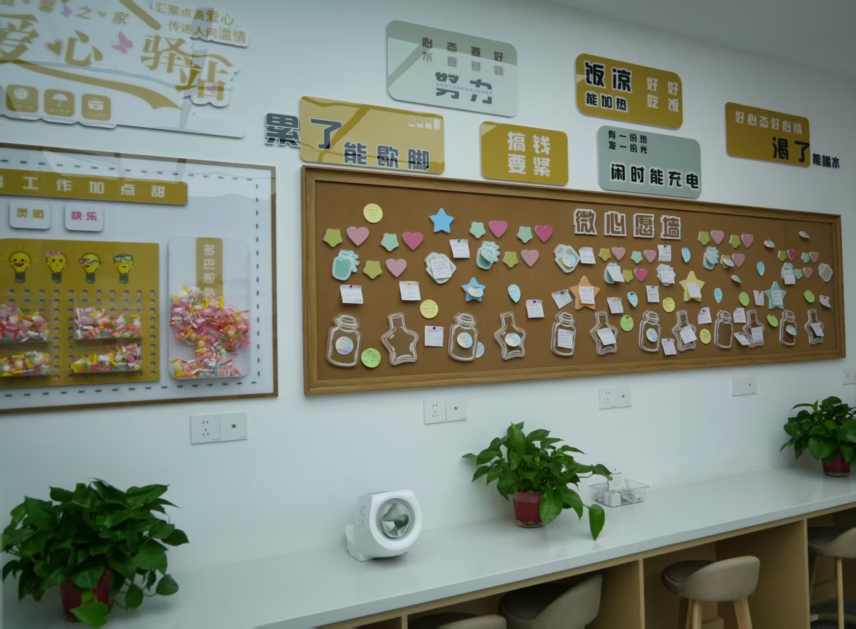 驛站選址于商戶密集、騎手集中的核心區(qū)域,旨在將昔日“管理的難點(diǎn)”轉(zhuǎn)變?yōu)榻袢铡胺?wù)的亮點(diǎn)”。這個(gè)約300平方米的空間,被精心規(guī)劃為“職工生活服務(wù)空間”“休閑娛樂空間”“宣傳教育學(xué)習(xí)空間”三大功能區(qū)域,并整合構(gòu)建了“職工服務(wù)平臺(tái)”和“基層治理平臺(tái)”,致力于成為團(tuán)結(jié)引領(lǐng)職工的政治中心、宣傳教育職工的文化中心、聯(lián)系服務(wù)職工的便民中心。