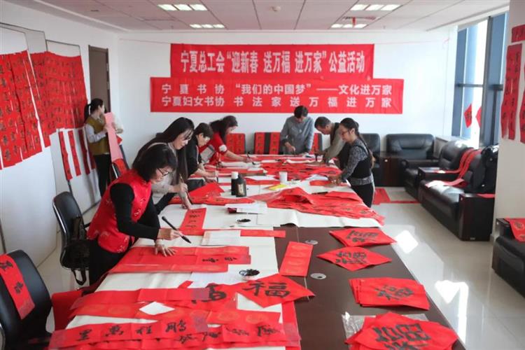 萬(wàn)里晴空風(fēng)和煦,春風(fēng)送暖福臨門。1月14日下午,自治區(qū)總工會(huì)機(jī)關(guān)舉辦首場(chǎng)“迎新春 送萬(wàn)福 進(jìn)萬(wàn)家”公益活動(dòng),有幸邀請(qǐng)到寧夏婦女書法家協(xié)會(huì)主席喬華以及趙萍、趙彥、蘇詠梅、何軍菁等6名書法家現(xiàn)場(chǎng)創(chuàng)作對(duì)聯(lián)等書法作品500份。一個(gè)個(gè)厚實(shí)飽滿的“?!弊?、一副副氣韻生動(dòng)的春聯(lián),寄托著對(duì)新的一年美好的期盼和祝福,讓大家在感受喜慶的同時(shí)還體會(huì)到了中國(guó)書法的傳統(tǒng)文化魅力,濃濃的新年氣息撲面而來(lái)。
