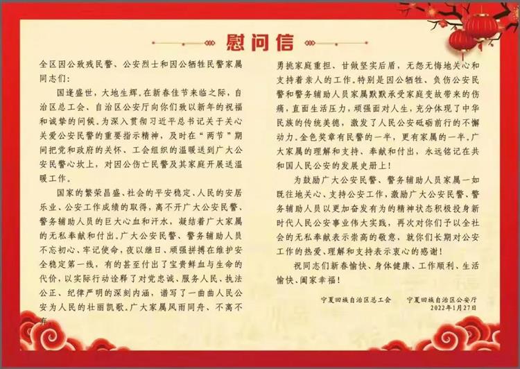 自治區(qū)總工會(huì)將繼續(xù)加強(qiáng)與自治區(qū)公安廳的協(xié)調(diào)對(duì)接,進(jìn)一步完善公安民警困難幫扶慰問等工作機(jī)制,努力做好關(guān)心關(guān)愛公安民警特別是公安烈士、因公犧牲家屬和因公傷殘公安民警工作,為建設(shè)平安寧夏貢獻(xiàn)工會(huì)力量。