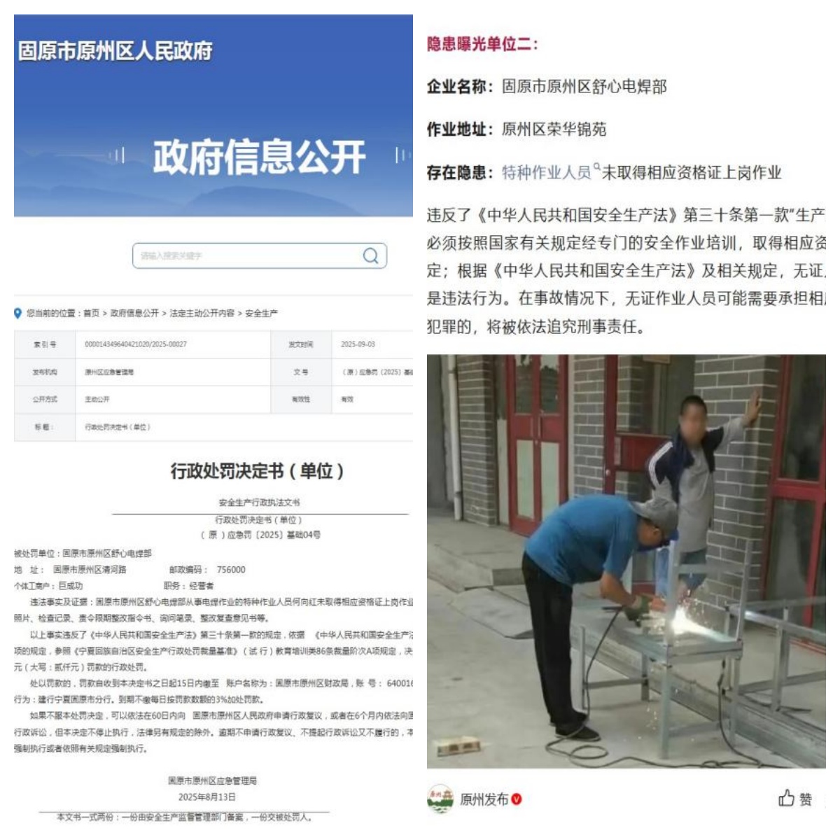 8月13日,原州區(qū)應(yīng)急管理局根據(jù)《中華人民共和國安全生產(chǎn)法》第九十七條第(七)項(xiàng)的規(guī)定,對兩名員工所在的電焊部處以人民幣2000元罰款的行政處罰;在“原州發(fā)布”政府融媒體平臺對該起人員密集場所違規(guī)動火作業(yè)事件進(jìn)行曝光,并將最終結(jié)果報(bào)送專班辦公室,整治工作形成閉環(huán)。